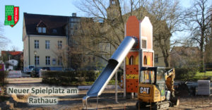 Aber nicht nur hier wird zur Zeit gebaut. Auch der Neubau des Spielplatzes auf dem Rathausplatz kommt voran. Das extra hergestellte Spielgerät in Form eines Ofens, welches sich Kinder wünschten, ist schon gut zu erkennen. Unter anderem haben die langen Lieferzeiten der Geräte dazu geführt, dass der Spielplatz nicht schon in 2018 fertig wurde, wie wir uns es gewünscht haben. Im Mai soll der Spielplatz eröffnet werden.